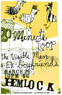 San Francisco's 20 Minute Loop plays original music for the hook-hungry mob, Ex-Boyfriends formed in the spring of 2003 when guitarist/vocalist Colin Daly and drummer Chris Ohnesorge decided to get together and kick their post-band breakup blues by trying out a new musical project. Although their chemistry was instantaneous, they quickly recruited bassist Peter Harb to complete the tried-and-true power trio model. Not surprisingly, the music that came out of practice space 69 was more vibrant and electric than anything any one of them had written before. The songs automatically came built-in with three part harmonies, hook-laden guitars, fluid bass lines and punchy, danceable beats. Armed with a truckload of stick-in-your-head songs and the need for you to dance at their shows, Colin, Peter and Chris are already on their way to becoming everyone's favorite Ex-Boyfriends. |